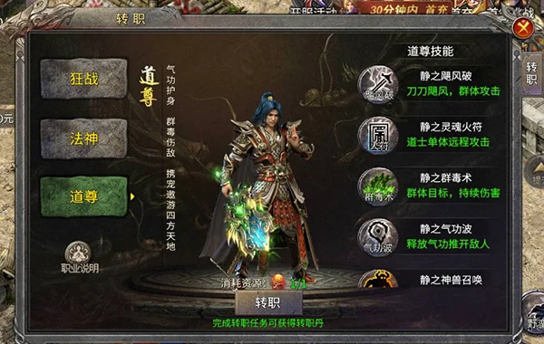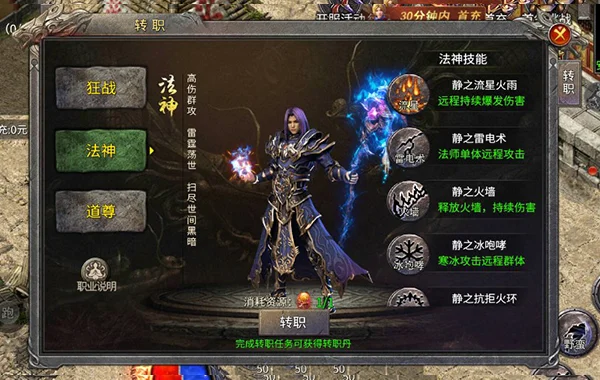 终极技能:静之流星火雨群攻技能,对范围区域最多8个敌人造成极高伤害;PVE技巧:魔法盾增强生存能力,聚拢区域内怪物,灭天火和流星火雨交替输出,刷怪效率最快;战斗技巧:控制与敌人距离,火墙封住走位,远程技能放风筝;可进阶觉醒为魔道,炎皇,御龙师其中之一;魔道:学习上古禁忌秘术,具备超群攻速和单体伤害,配合暴伤增伤命格远程制敌;炎皇:吸收世界异火,具备超群法力值和持续伤害,配合法力增伤命格团战焚灭对手;御龙师:召唤远古兽灵作战,兽灵具备伤害控制技能,配合召唤兽增伤命格禁锢敌人。
