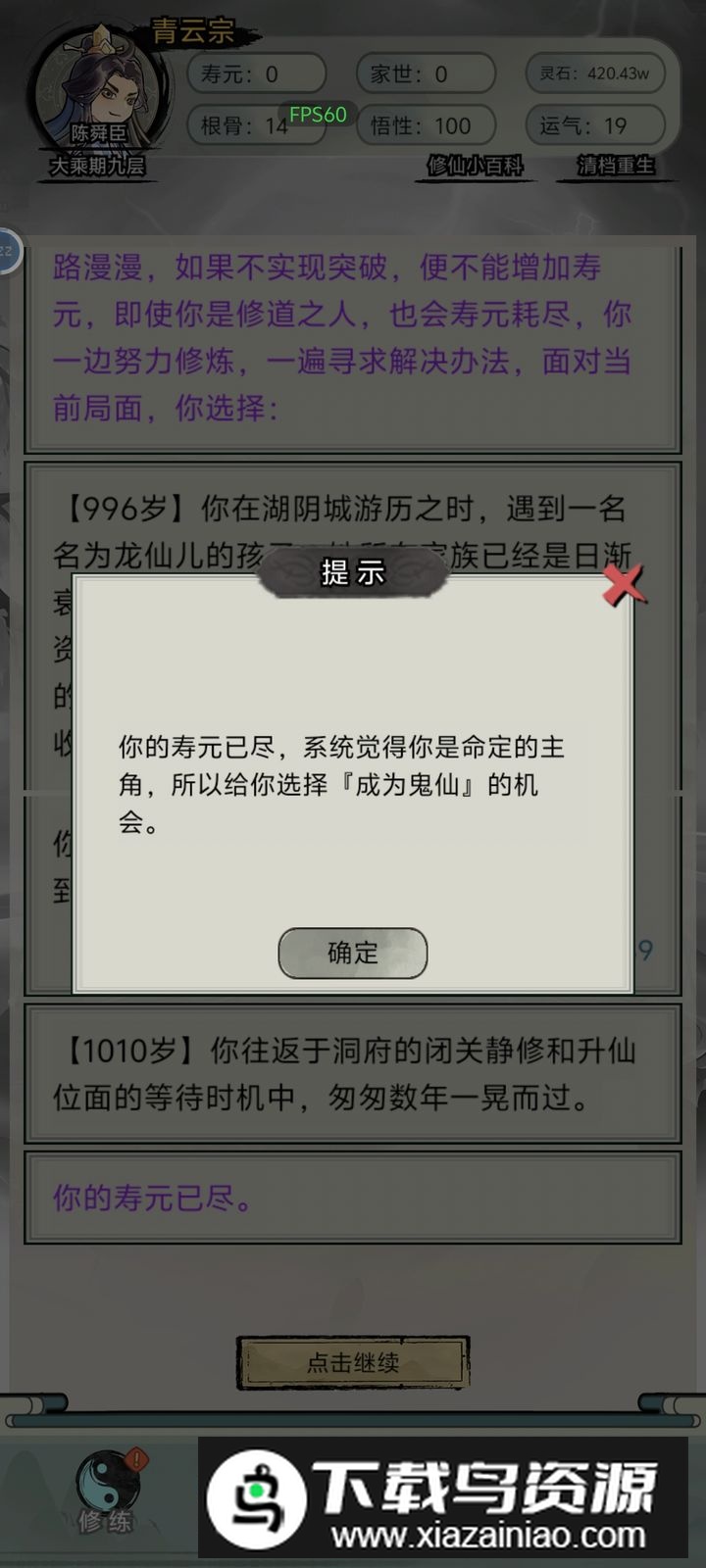 9.部分事件选择错误会导致角色死亡,在10气运前提下需特别注意:青云宗夺舍事件两次均选配合,不可反抗;金丹期杨子叶幻阵事件选仔细观察,勿直接动手;飞升时第一次选不动,第二次选战术冲锋;其他对战妖兽魔物事件一般直接开打。