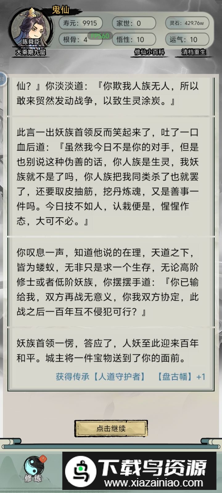 2.转修鬼仙后,参与人妖战争并击败妖族首领,可获得【传承】人族守护者称号与天品法宝盘古幡;之后等待升仙大劫再次开启,即可重新渡劫飞升。