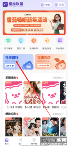 1、打开软件后,在页面点击“升级赚钱”即可开始赚钱。