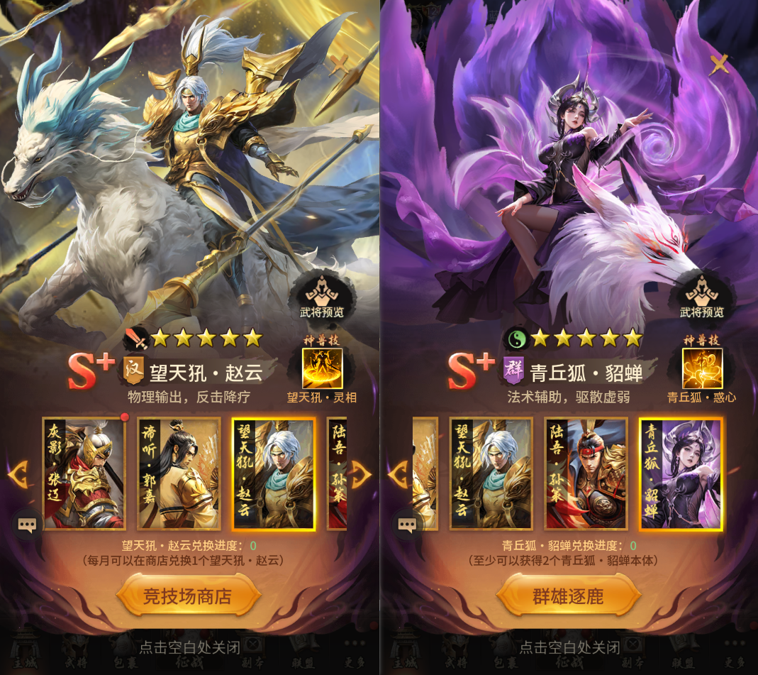 通过征战关卡获取S+灰影・张辽;试练塔突破层数领取S+谛听・郭嘉;竞技场积累声望兑换S+望天辍ふ栽;联盟战奖励S+陆吾・孙策;群雄逐鹿活动产出S+青丘狐・貂蝉。