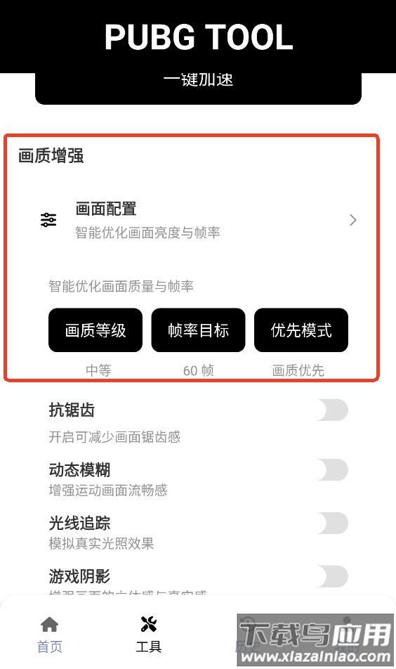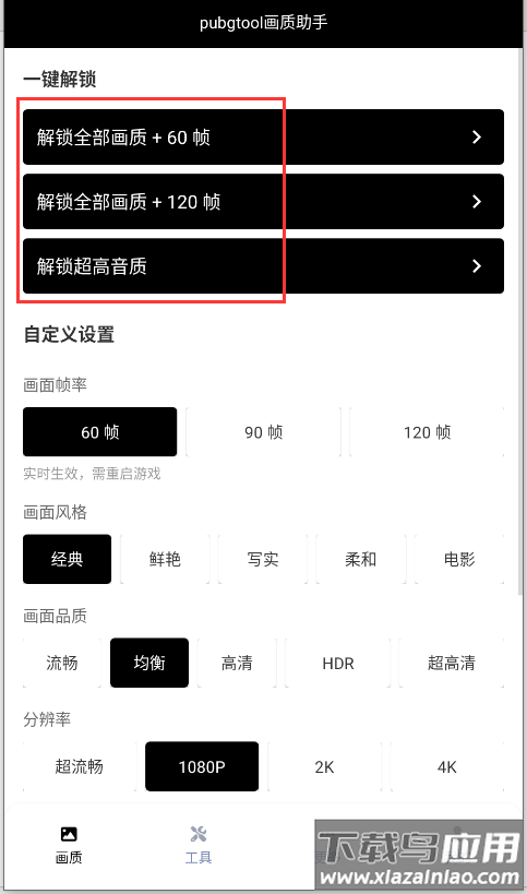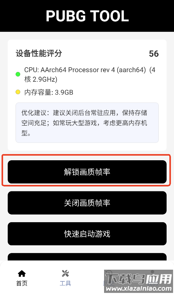 1、下载安装后启动pubgtool120帧率,点击主界面的解锁画质帧率功能;