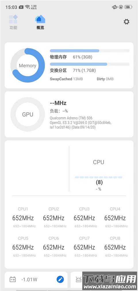 该模式下主要提供功能与概览两大板块。功能模块包含帧率记录、充电统计、耗电统计、应用管理、活动服务管理、温控编辑及屏幕测试;概览模块则用于查看物理内存、CPU运行状态、电量温度、设备型号与开机时长等系统信息。