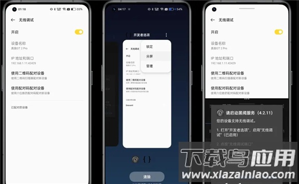 6、启动黑阈服务:进入开发者选项的无线调试设置页,通过分屏模式打开黑阈应用,点击无线调试端口进行配对。