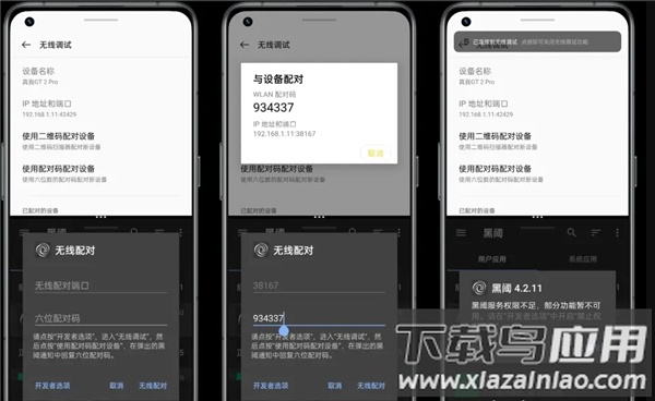 7、输入配对码:在无线调试页面点击使用配对码配对设备,在黑阈中输入显示的WLAN配对码(如934337),点击无线配对;配对成功后关闭分屏返回黑阈主界面。