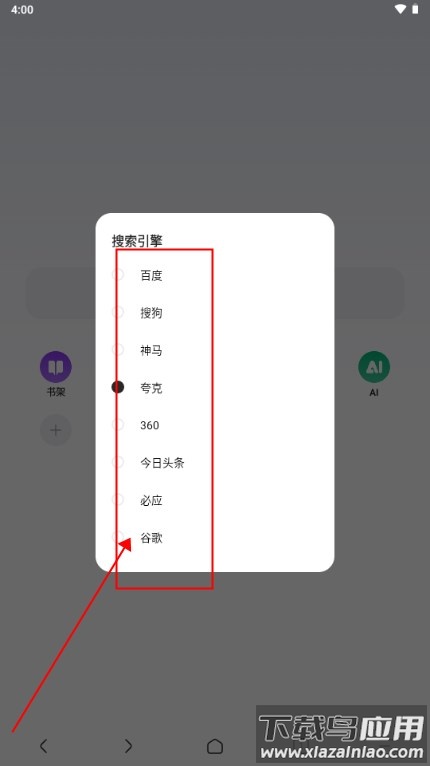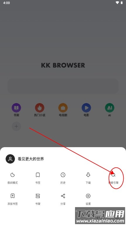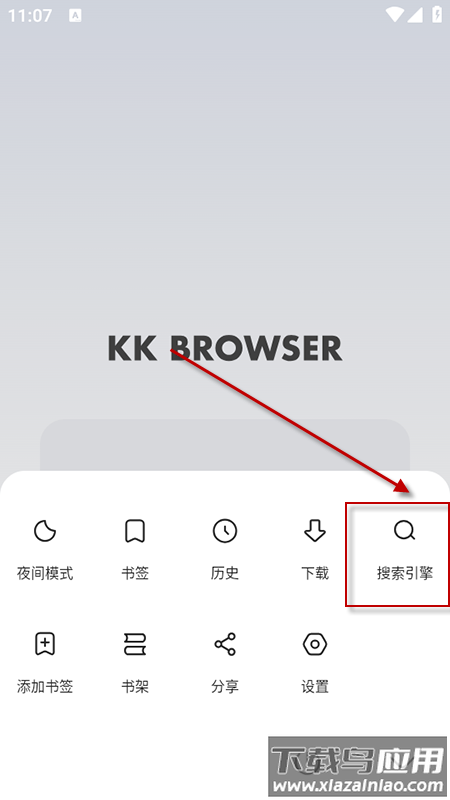 3、点击右下方三条横线图标,在弹出的菜单中点击“搜索引擎”,直接选择需要使用的引擎即可完成切换。