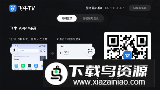 扫码登录:打开手机端飞牛App,进入首页点击左上角头像,选择扫码功能,扫描电视屏幕二维码即可快速登录,登录时需在手机端确认授权。