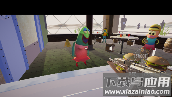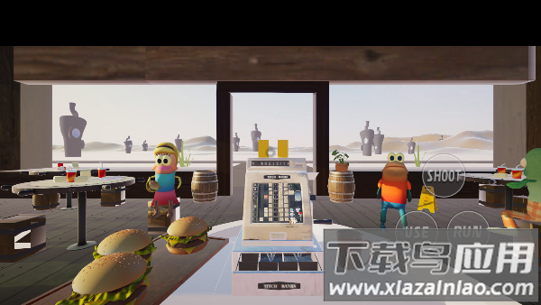 2、开始游戏,章鱼哥来到汉堡店工作,可以看到三个操作按钮,把目标点对准一样东西后点击use可以将它拿起,点击run可以加速跑。