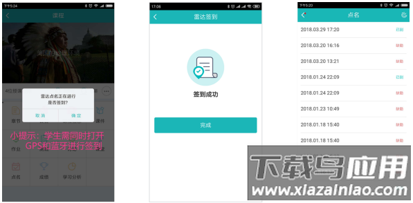 1. 如收到雷达点名签到通知,请开启手机网络、GPS和蓝牙功能,点击“确定”;