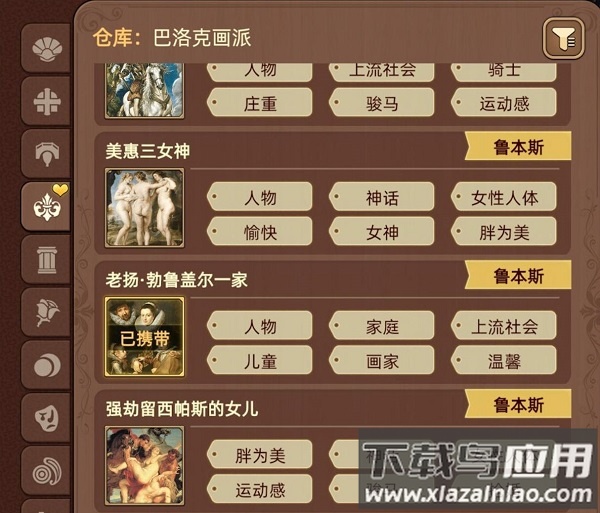 每幅画作设有6个空白标签位,需要玩家手动选择合适标签。例如《杜普教授的解剖课》适合标签:群像、学术、严肃;