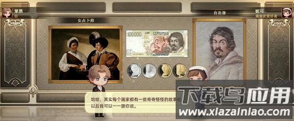 在讲述巴洛克大师卡拉瓦乔生平故事时,背景会动态切换展示他的代表作品;当对话内容涉及金钱话题时,背景设计会相应变成钞票样式;