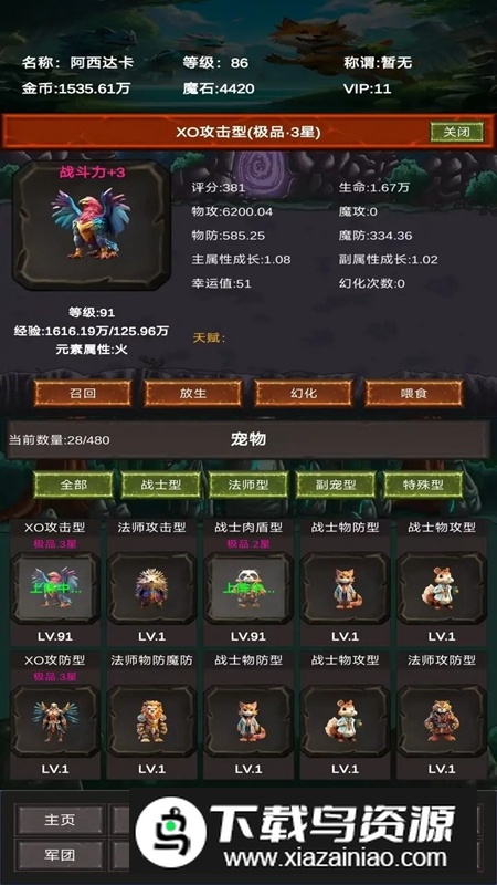 2.深度养成系统:通过喂食、训练与升级不断提升神宠能力;还能为它们装备专属道具与饰品,强化属性与技能效果,一步步培养出属于你的传说级伙伴。