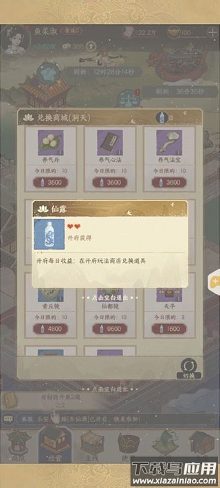 在兑换商店中,使用仙露道具兑换各种消耗道具;仙露主要通过开府系统获取。