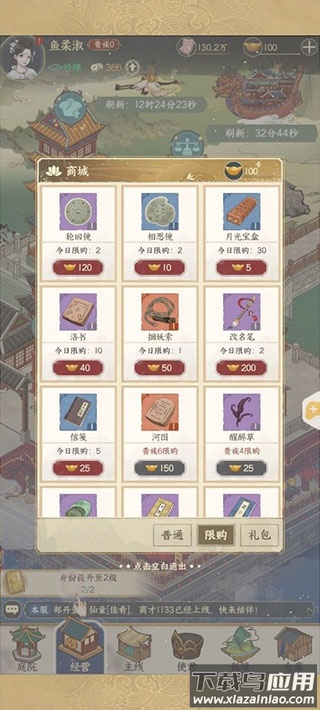 元宝商铺分为普通、限购和礼包专区,使用元宝可购买相应道具物品。