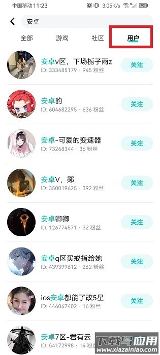 3 点击搜索按钮,在用户列表中即可找到好友并进行关注。