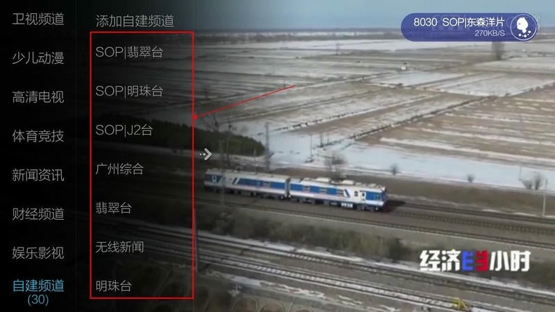 4、通过遥控器调出菜单界面,可见右侧新增约三十个自建频道,此时即可正常收看,效果如下图: