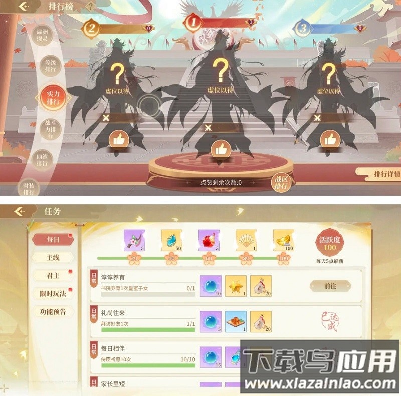 完成每日任务达到活跃度可领取100绑金与1云裳币等奖励;为排行榜前三名点赞可获得10绑金,每日限五次。