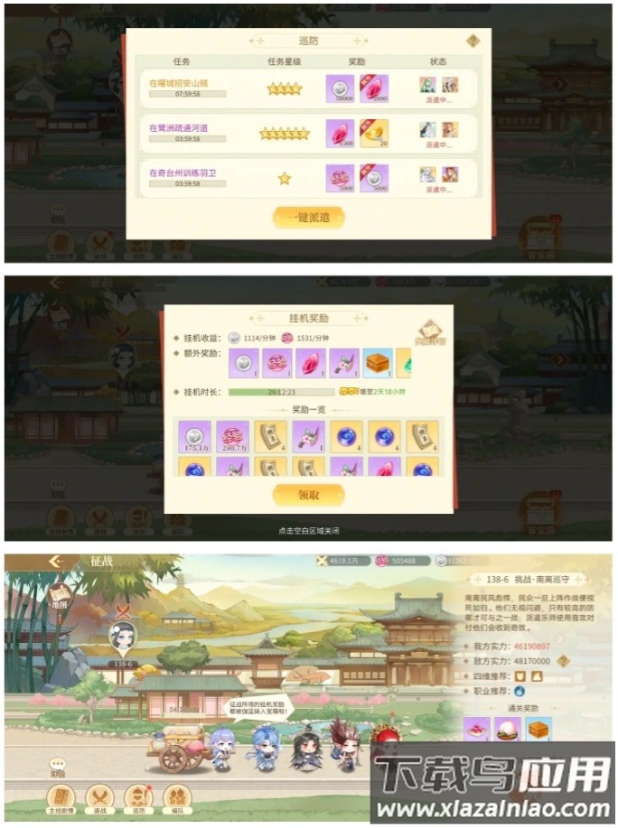 巡防可能获得绑金奖励;挂机是银币与经验主要来源,偶尔产出始祖碎片;挑战关卡可手动操作,难度适中。