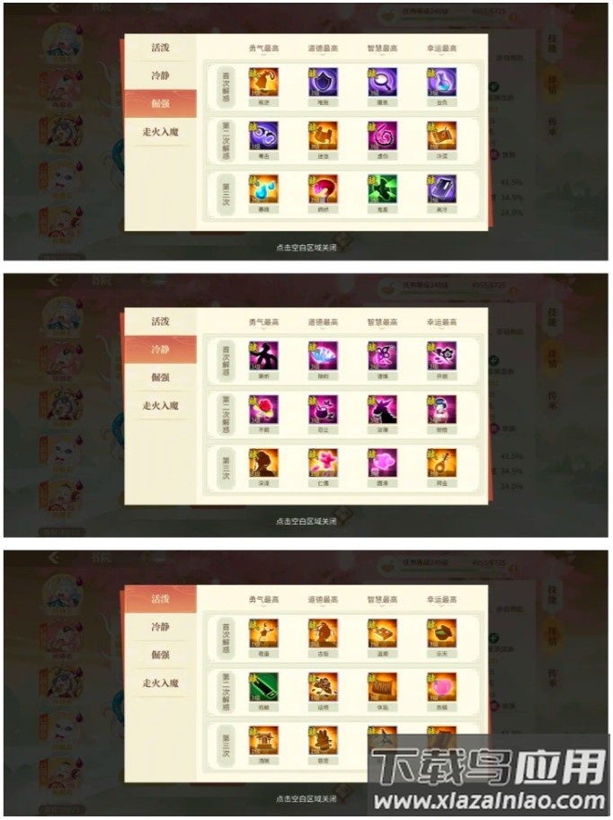倔强系中毒舌天赋在提升血量时很实用;冷静系淡薄天赋适用于门派据点战,圆滑天赋的魅惑效果建议给纯天命角色;活泼系在皇城司任务中能发挥作用;走火入魔系最后四个天赋颇具趣味性。