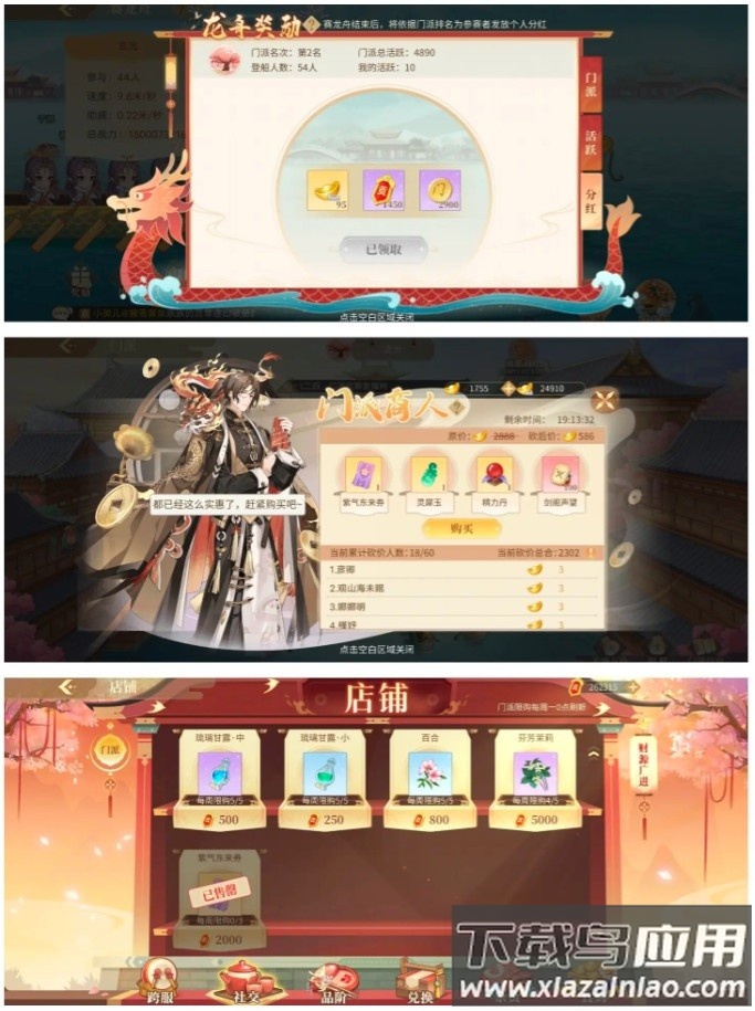 参与龙舟活动即使未划船也能根据门派排名获得绑金,活跃度满100额外奖励30绑金;门派商人处商品可砍价至负数,但购买时会自动校正;门派商店每周刷新三张紫气卡。