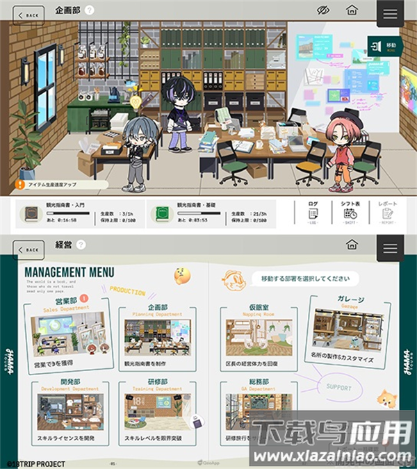 经营模块中玩家可编排轮班表,经过一定时间收获观光指南书等培养道具;经营分为多个部门,每个部门负责不同内容。