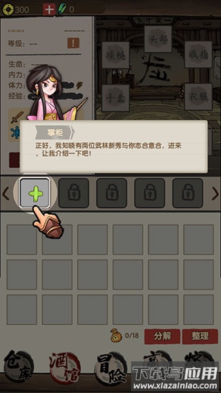 1、初次进入游戏,先点击界面左侧的加号按钮,添加准备出战的侠客;
