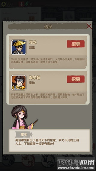 2、新手玩家可以从系统推荐的两位侠客中任选一位作为起始伙伴;