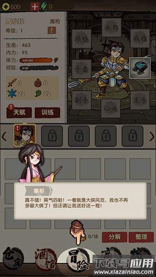 踏入这片刀光剑影的江湖世界,你将开启一场轻松悠闲的武侠之旅。游戏采用挂机放置的玩法模式,让你在忙碌之余也能稳步成长。你可以自由选择心仪的侠客角色,一路闯关击败各路强敌,同时不断强化自身武学修为。若你钟情于此类武侠题材的放置游戏,不妨亲自体验一番。