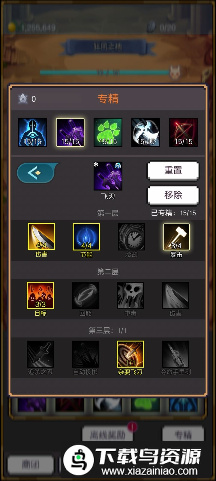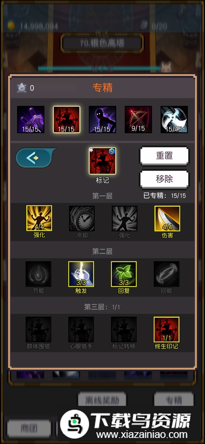 技能推荐标记、扫射、飞刃,初期可用瞄准过渡,前面难度较低可自由搭配,反正能无限重置。其他技能根据实际情况选择,确保平稳度过前期,加点图示仅供参考,具体根据自身装备调整;