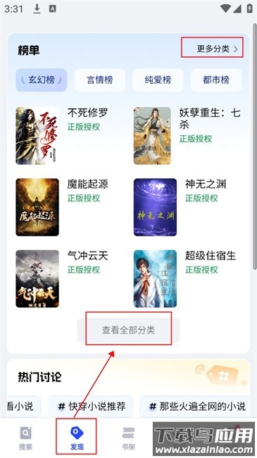 1、进入发现专区,通过榜单推荐寻找作品,点击查看全部分类或更多分类选项;