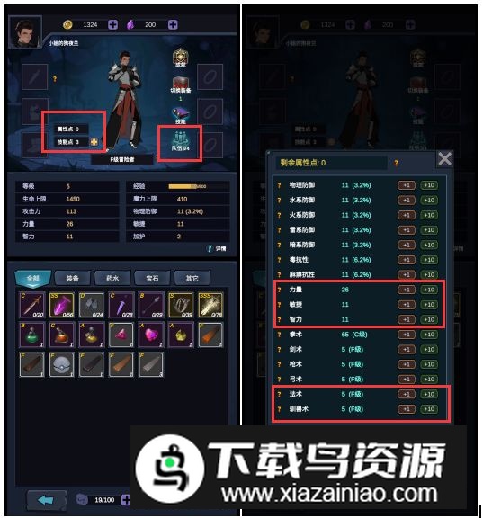 2. 打开右下角背包界面,在角色腿部两侧区域可进行属性点分配、技能学习和队伍调整;