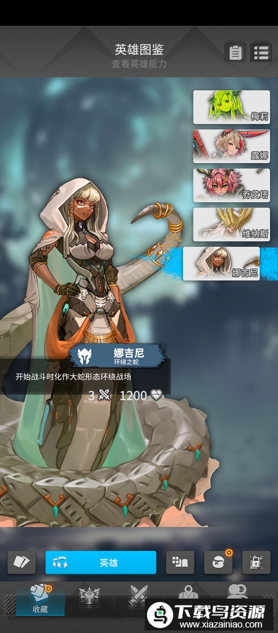 5. 娜吉尼:登录第二天赠送,开局变身大蛇沿场地边缘移动,全身具备碰撞伤害,血量高达1200点,攻击仅为3;可搭配牛奶、裂地斩、茶壶与爆米花等卡牌,裂地斩在右下角斜向使用形成三角区域,放置茶壶可多次弹射回复大量生命,爆米花每次碰撞英雄增加1点攻击,该加成永久有效。