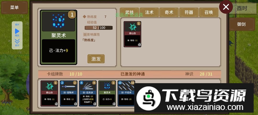 3. 装备购置与刷怪路线:灵石积累至2300后,花费1000在聚宝轩购买天关盾并祭炼至二级,随后前往牙山刷取经验;技能配置可根据熟练度调整,低熟练时聚灵术加2张,巨兵术与千仞术各减1张。