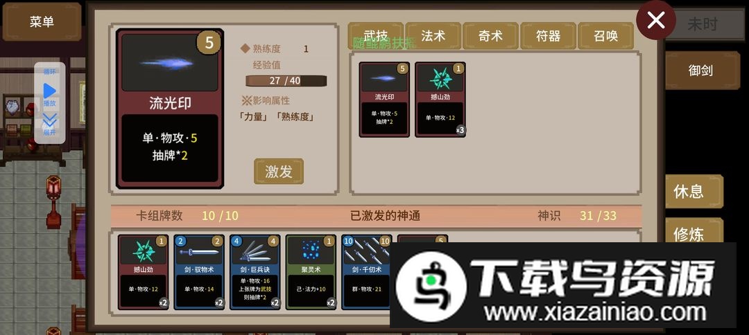 图示为可挑战的第二个狞狩;升至练气十一层后,前往城东玄法店购买流光印,调整技能配置。