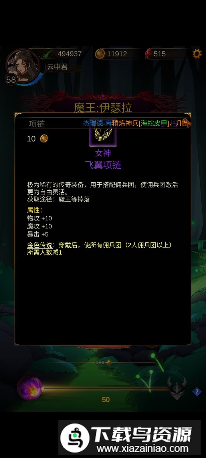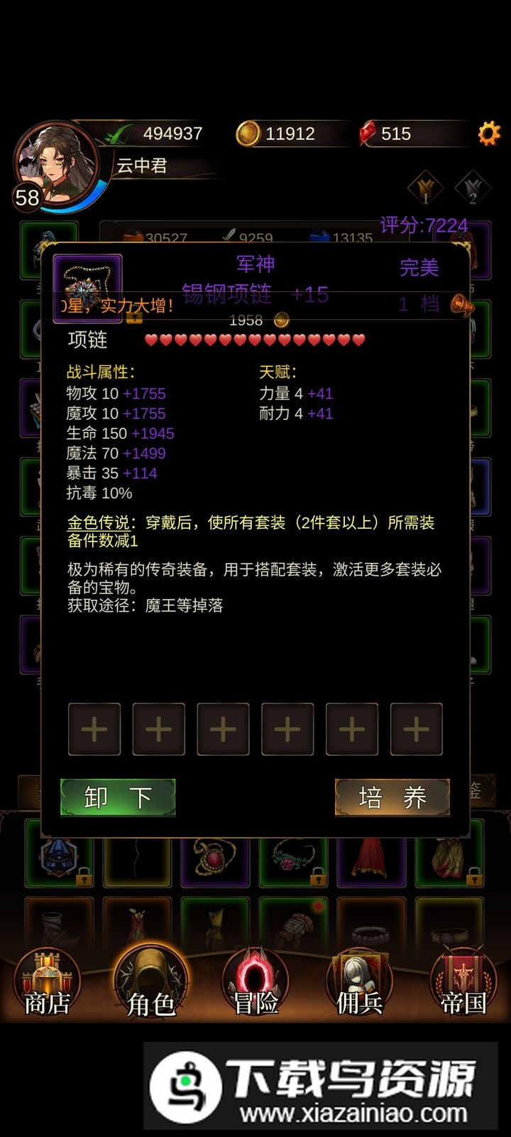 4. 军神装备获取途径包括开箱、佣兵旅社与魔王掉落,但概率极低。若未获得,可通过积攒游戏币在PK商店购买;女神项链为后期装备,配合援助系统可减少角色上场数量;