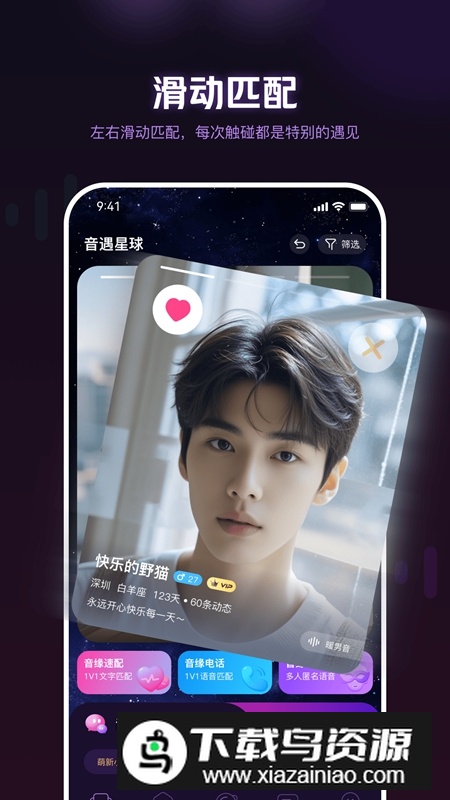 1.语音匹配:通过简单的滑动操作,快速匹配到与你声音契合的朋友,开启即时语音交流;