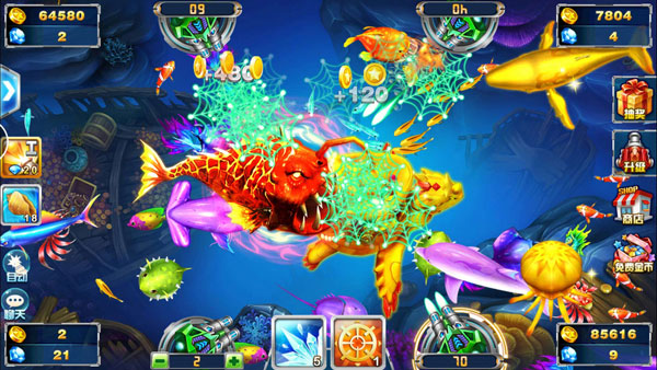 2、通过点击屏幕控制炮台射击,捕捉游动的鱼群;