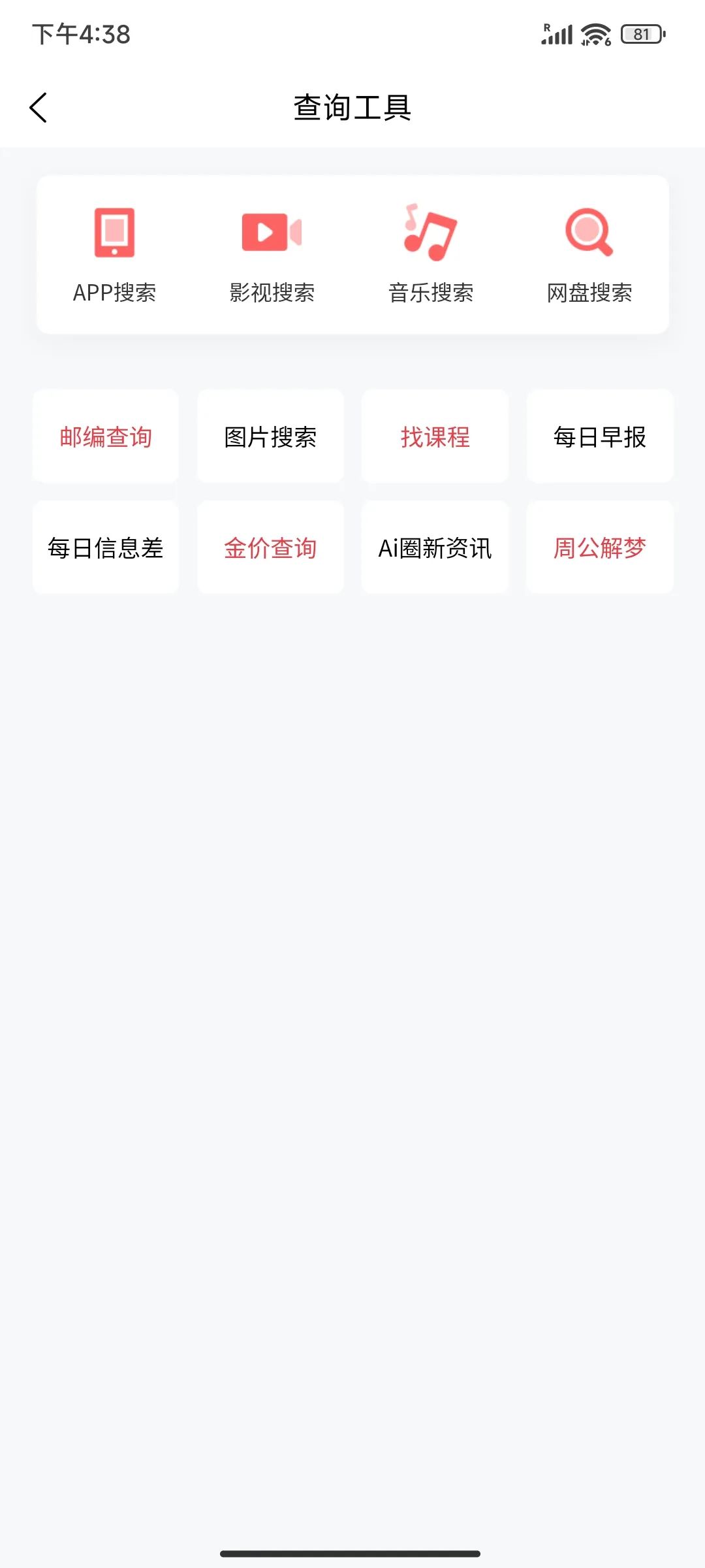 在日常工具和查询工具顶部,还设有文件或软件、影视、音乐和网盘搜索入口。