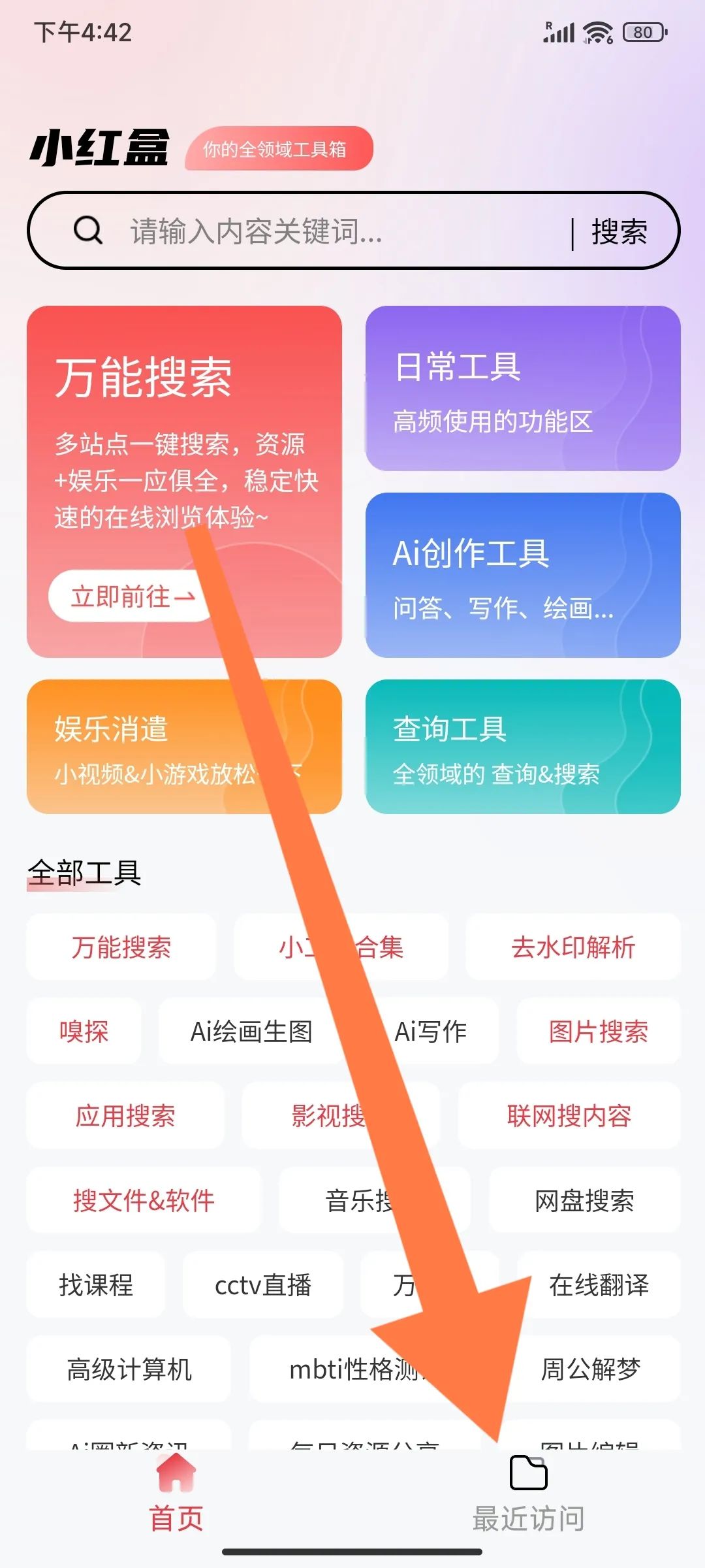 所有功能被整合在五大板块中:万能搜索、日常工具、AI创作工具、娱乐消遣和查询工具。