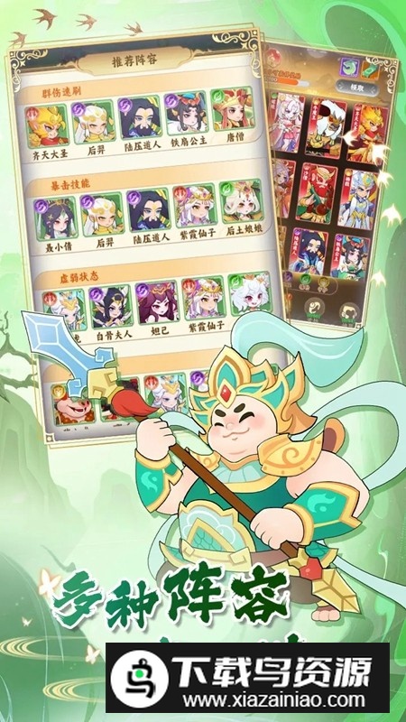 2.策略卡牌对战:提供四大职业与多种阵营选择,七套推荐阵容自由搭配;收集并培养西游角色,根据技能与属性组合阵容,展开富有策略的即时卡牌对决。