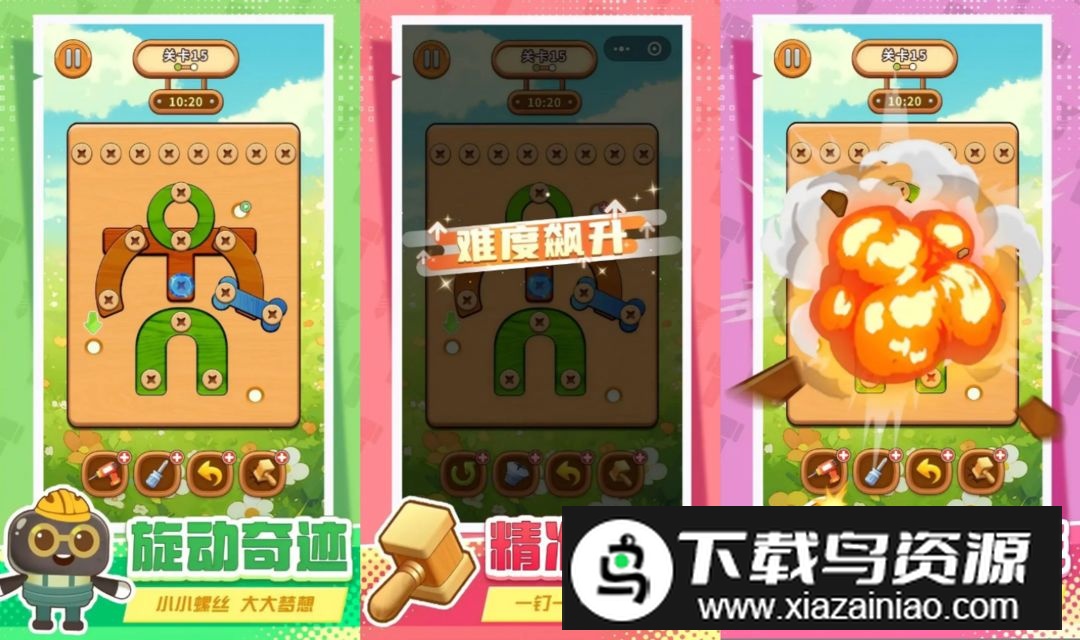 握紧你的虚拟扳手,挥动那充满魔力的锤子,在螺丝拧一拧的世界里开启一场轻松又烧脑的益智挑战。你需要仔细观察木板结构,巧妙规划顺序,将一颗颗顽固的螺丝全部拆除。游戏画面清新,操作简单,却十分考验你的逻辑思维与策略布局。每一关都是全新的谜题,带给你源源不断的新鲜感与成就感。喜欢这类解谜游戏的话,就在本站下载体验吧!