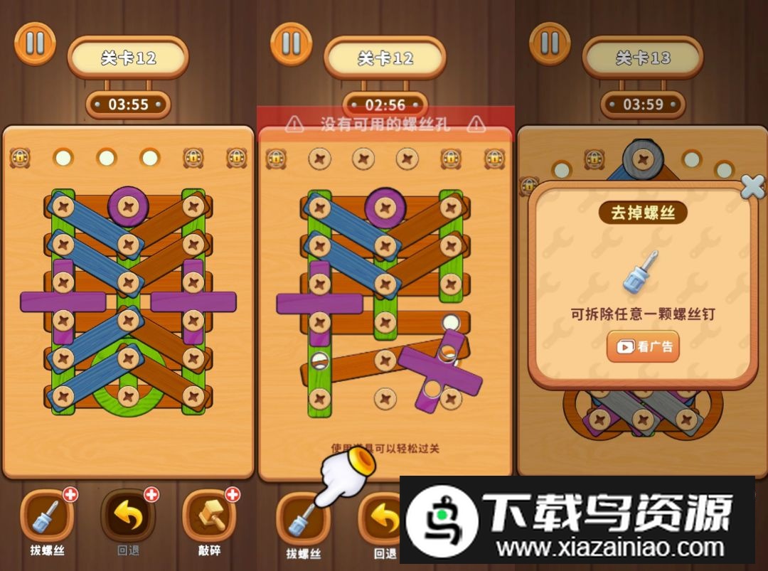 游戏提供了多种实用工具:拔螺丝可以任意拆除单颗螺丝;回退能撤销上一步操作;敲碎则能震碎木板并影响周围结构。