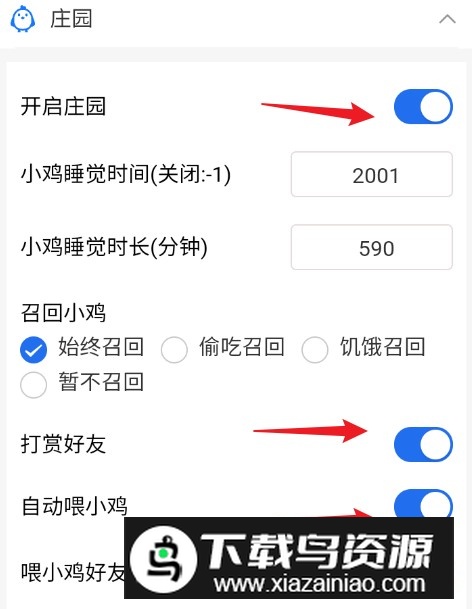 4、进入庄园选项,打开开启庄园、打赏好友和自动喂小鸡功能,其他设置可根据个人需要调整。