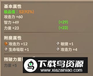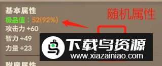 本例中基本属性为攻击力+60、智慧+20;随机属性为智慧+29、力量+23;极品值为29+23=52;精炼后最高可达52÷92%≈56~57。