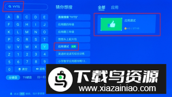 2、打开电视进入主页,遥控器选择左上角搜索框,输入YYTS,进入应用调试并安装运行;
