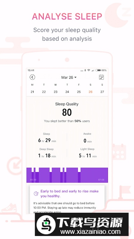 1. 全天活动与睡眠记录:仅携带手机即可统计步数、距离及卡路里,搭配手环更可监测睡眠状态;