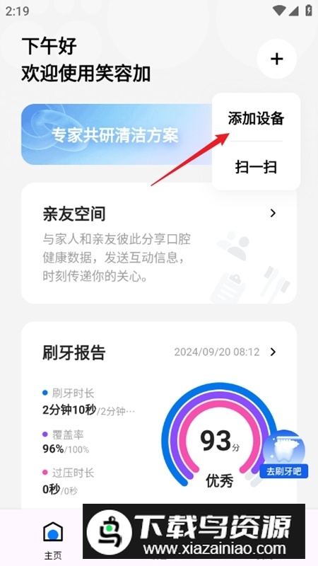 2.进入设备连接环节,确保牙刷电量充足并靠近手机;保持牙刷屏幕常亮,点击右上角“+”添加设备,或直接选择“立即添加”选项;