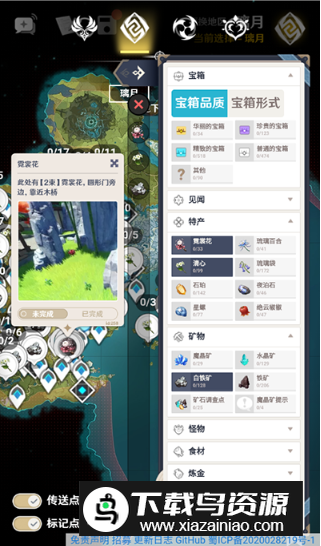 2、打开地图界面后,可以看到各类资源标记已显示在地图上,包括宝箱、矿物与采集点。