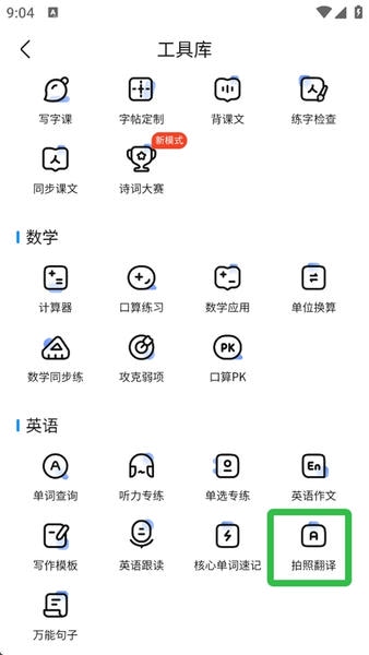 2、在工具库中下滑至英语相关栏目,选择“拍照翻译”功能;