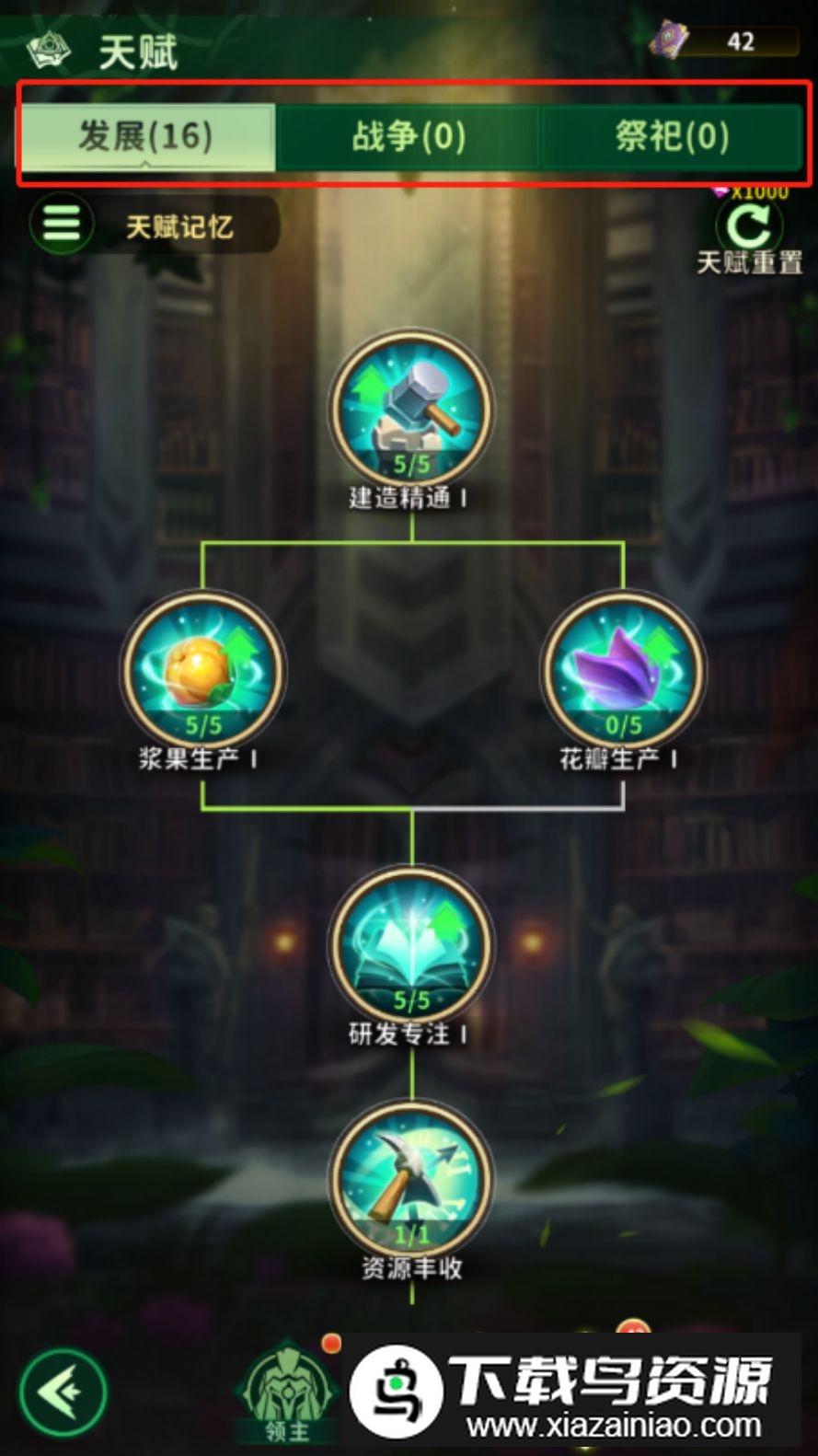 领主天赋划分为三大方向:【发展】【战争】【祭祀】。